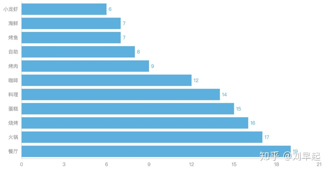 可以看到在800多家美食店铺中,餐厅名中出现最多的还是火锅、烧烤、蛋糕、咖啡,再绘制量化的条形图