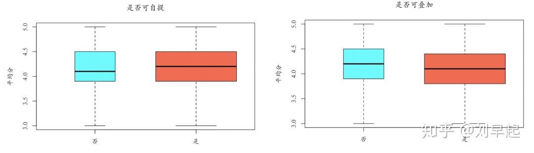 上图分别是优惠券是否可以叠加和商品自提与平均分的箱线图,可以看到,大多数商家都提供这两项功能,并且平均分比没有该选项的商家要高。所以如果想开一家美食店,这两项功能需要考虑哦。