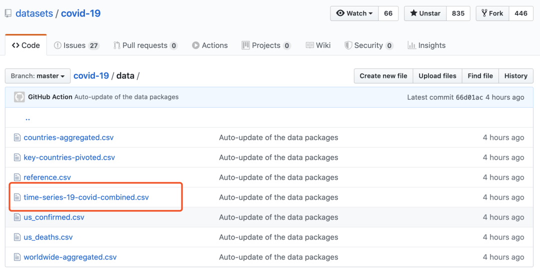 这就导致很多使用了该接口的其他接口/第三方库直接失效(比如我强烈推荐的Akshare),虽然我们依旧能够从该项目中下载json数据自己处理但是却比较麻烦,因此我们使用其他项目提供的数据,比如这个名为covid-19[1] 的项目也提供了全球历史数据