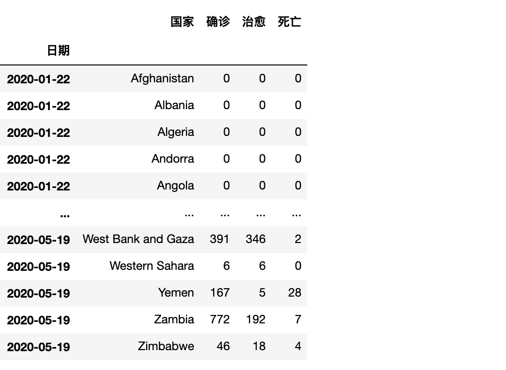data1.columns = ['日期','国家','确诊','治愈','死亡','none']