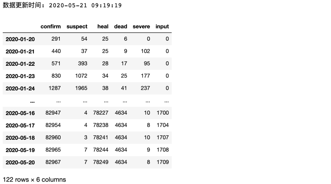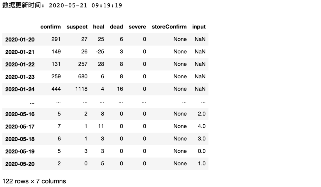 中国疫情历史数据相对来说比较好搞定,使用AkShare接口[3]一行代码就能拿下,记得提前pip install akshare