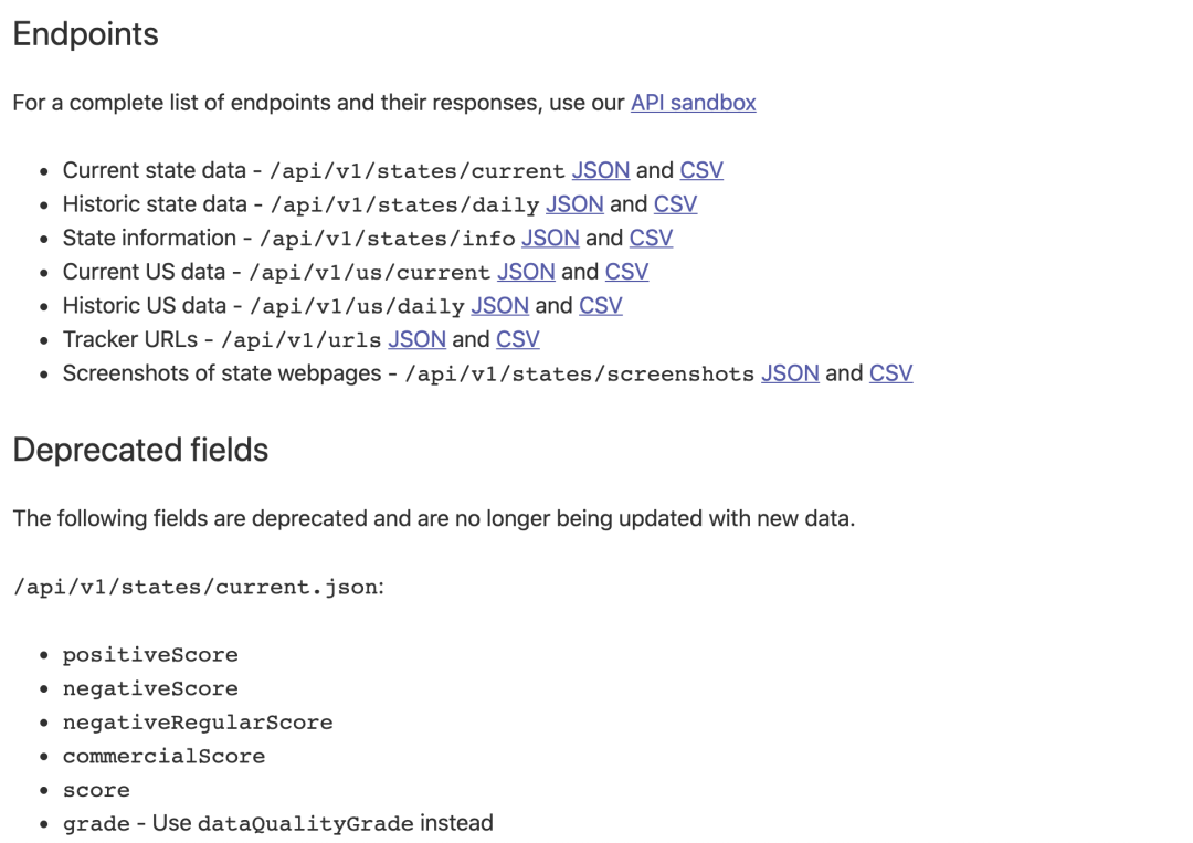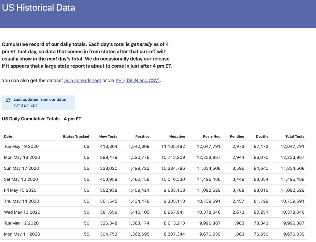 可以看到,除了确诊数据还有接受检测的人数等数据,甚至还提供API,感兴趣的读者可以自己查阅使用