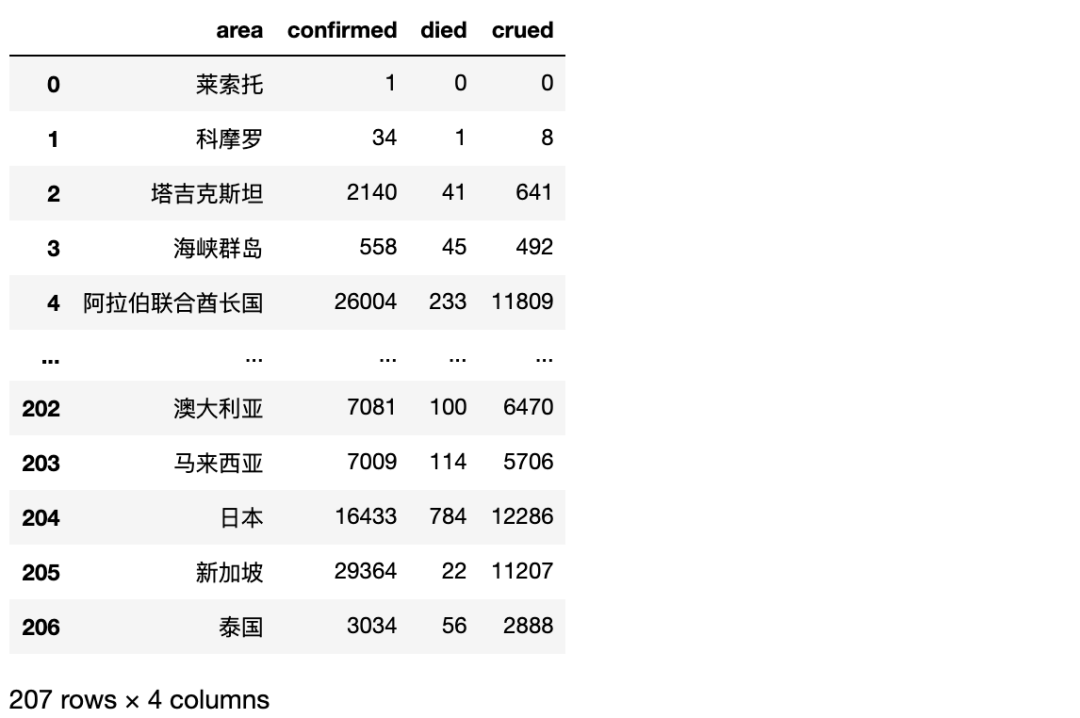 上面的代码使用pd.read_html直接读取,再稍作处理即可得到最新的全球疫情历史数据,不过国家名称为英文需要翻译一下