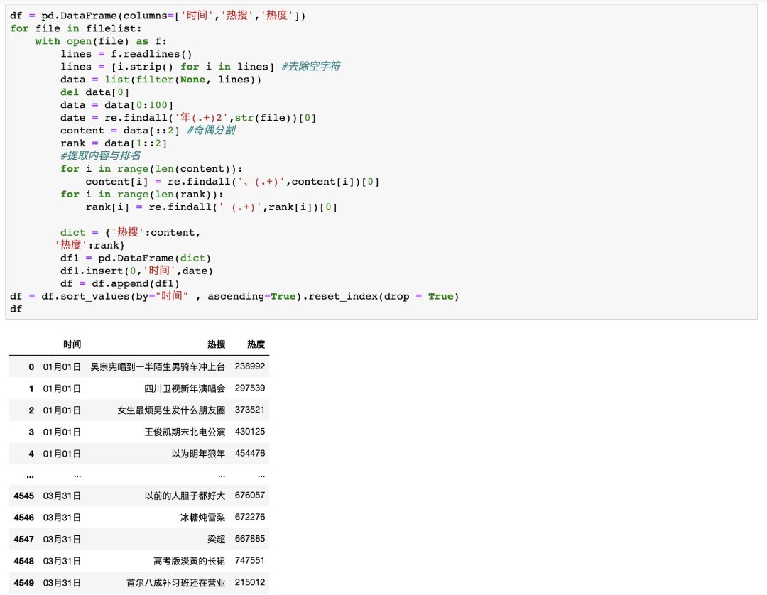 打开方式和其他文件类似使用with语句,返回一个list,但是这个list并不能直接为我们所用,第一个元素包含时间,后面每天的热搜和热度也不是直接存储,含有markdown语法中的一些没用的符号和换行符,而清洗这些数据就是常规操作了,使用下面的代码即可,主要就是使用正则表达式,看注释