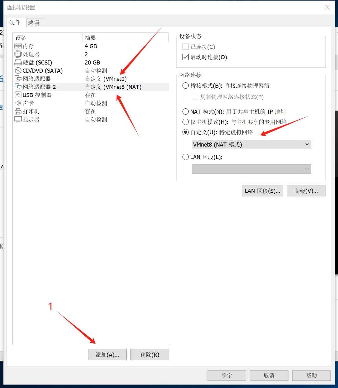 - 添加网络适配器,两个适配器都选择自定义模式,适配器2选择VMnet8(NAT模式),适配器1选择VMnet0(即桥接)