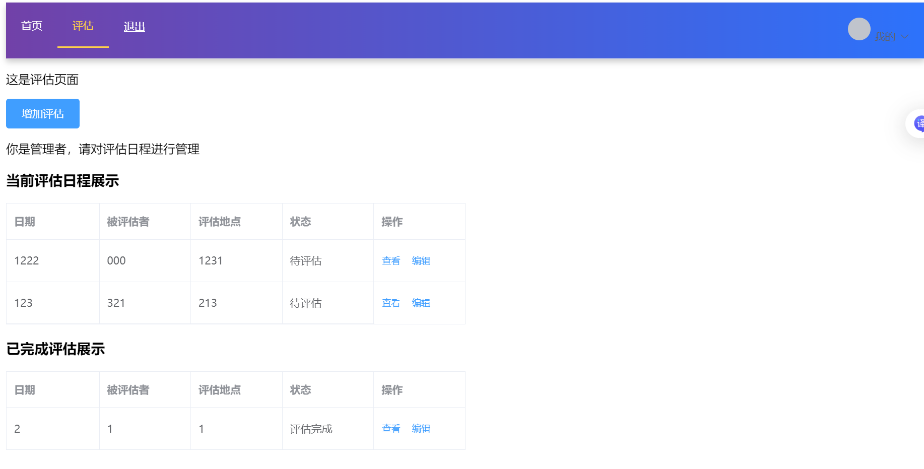 对未评估的查看可以进行评估,评估过的只有查看功能,这里的数据我瞎填的,没有规范,我未来的计划是加上消息通知跟时间段可评估,让评估更加流程化,评估过程没什么好说的,增加数据,打分机制,还有上传照片,上传现在也只是个形式