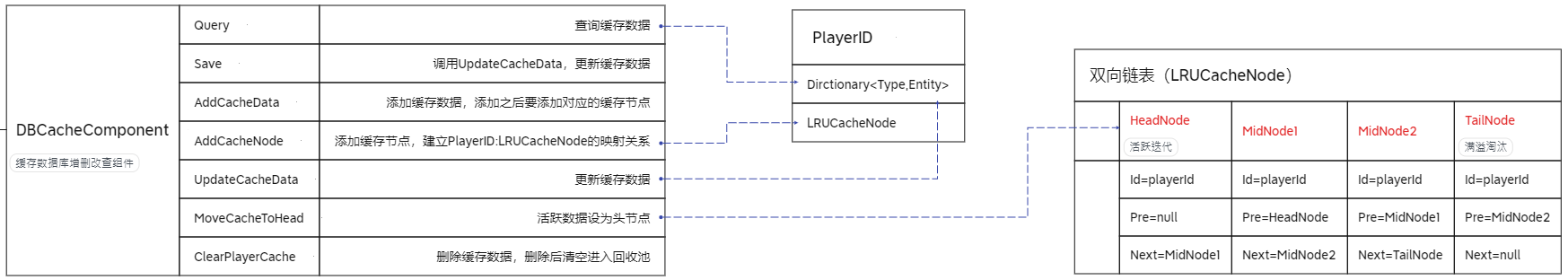 DBCacheComponent定义了两个映射关系LruCacheNodes、UnitCachePool用于查询数据和判断数据是否加入到缓存管理,HeadCacheNode、TailCacheNode辅助管理链表顺序,LRUCapacity在Awake时读取配置的缓存容量常量。