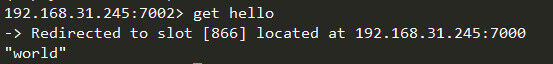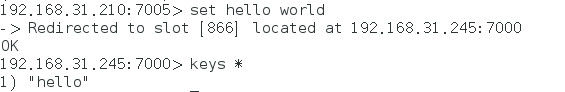 8. 集群验证 在第一台机器上连接集群的7002端口的节点,在另外一台连接7005节点,连接方式为 redis-cli -h 192.168.31.245 -c -p 7002 ,加参数 -C 可连接到集群,因为上面 redis.conf 将 bind 改为了ip地址,所以 -h 参数不可以省略。 在7005节点执行命令 set hello world ,执行结果如下: