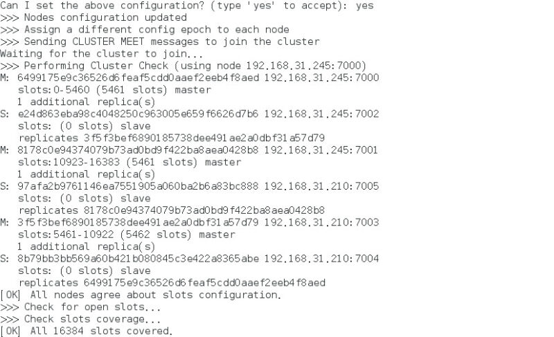 之后再运行 redis-trib.rb 命令,会出现如下提示: 输入 yes 即可,然后出现如下内容,说明安装成功。