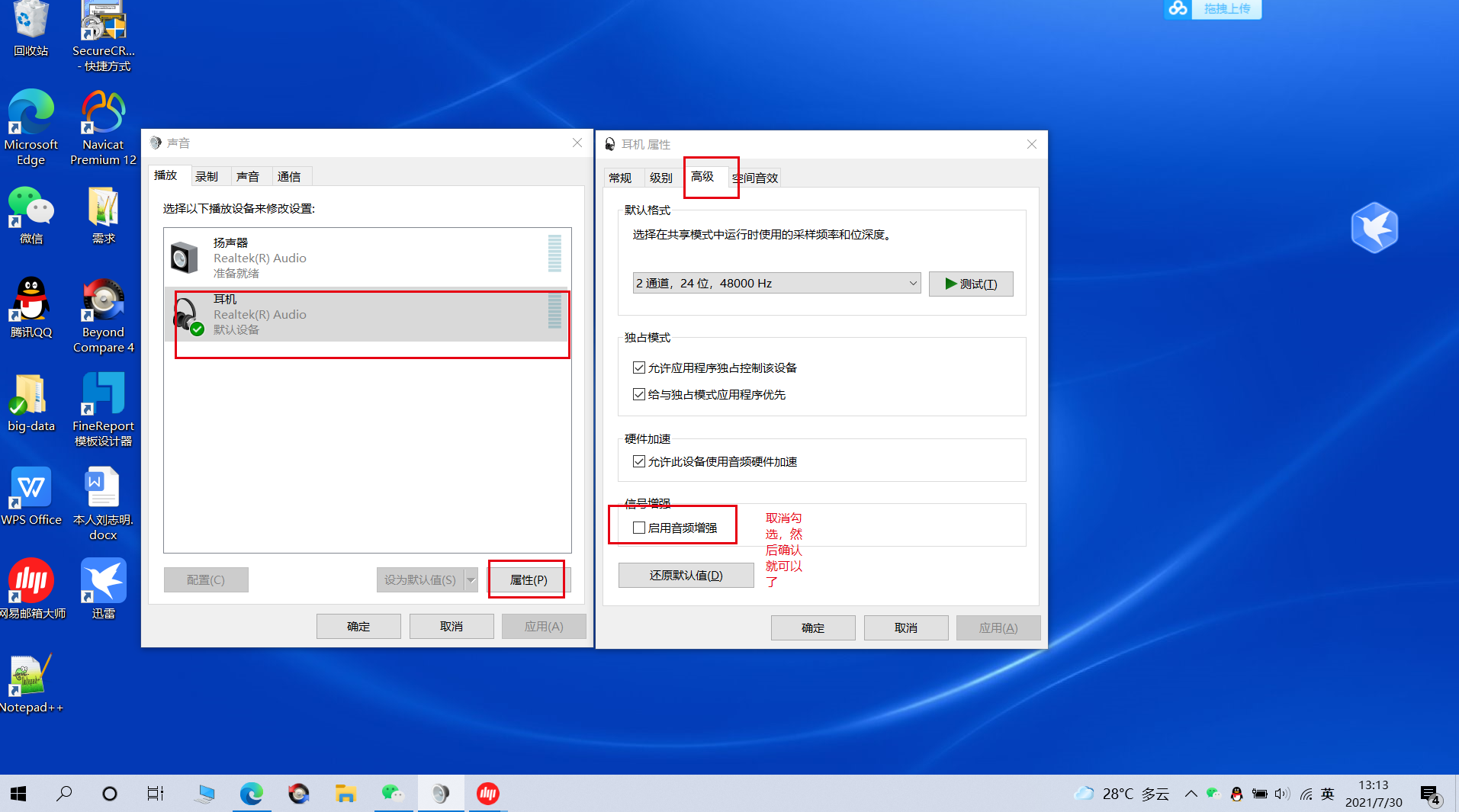 找到声音,选中耳机 ---属性---高级--取消启用音频增强-确认