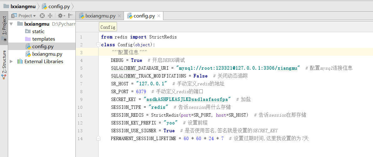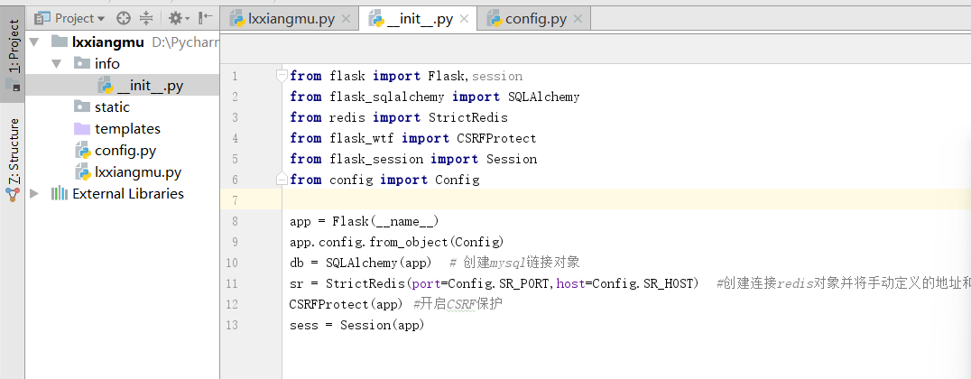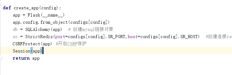 1 def create_app(): 2 app = Flask(__name__) 3 app.config.from_object(configs[config]) 4 db = SQLAlchemy(app) # 创建mysql链接对象 5 sr = StrictRedis(port=configs[config].SR_PORT,host=configs[config].SR_HOST) #创建连接redis对象并将手动定义的地址和端口加入 6 CSRFProtect(app) #开启CSRF保护 7 Session(app)