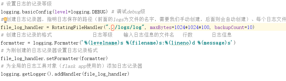 1 import logging 2 from logging.handlers import RotatingFileHandler 3 4 # 设置日志的记录等级 5 logging.basicConfig(level=logging.DEBUG) # 调试debug级 6 # 创建日志记录器,指明日志保存的路径(前面的logs为文件的名字,需要我们手动创建,后面则会自动创建)、每个日志文件的最大大小、保存的日志文件个数上限。 7 file_log_handler = RotatingFileHandler("../logs/log", maxBytes=1024*1024*100, backupCount=10) 8 # 创建日志记录的格式 日志等级 输入日志信息的文件名 行数 日志信息 9 formatter = logging.Formatter('%(levelname)s %(filename)s:%(lineno)d %(message)s') 10 # 为刚创建的日志记录器设置日志记录格式 11 file_log_handler.setFormatter(formatter) 12 # 为全局的日志工具对象(flask app使用的)添加日志记录器 13 logging.getLogger().addHandler(file_log_handler)