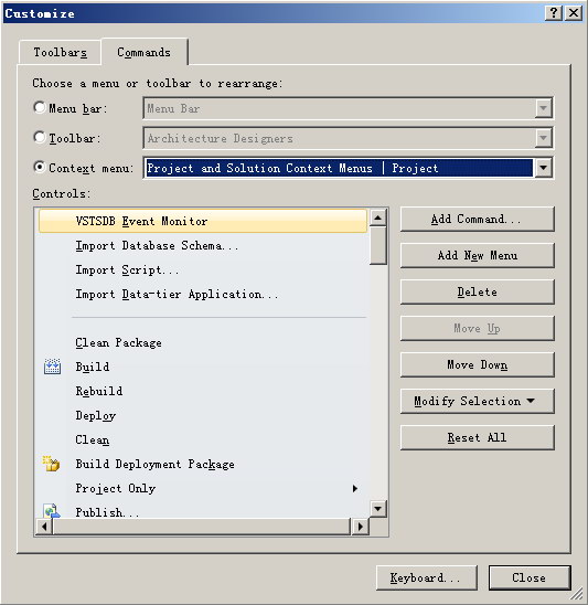 Tools -> Customize -> Commands -> Context menu -> 下拉框选Project and Solution Context Menus | Project