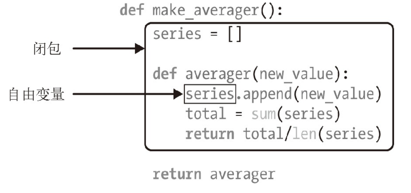 在 averager 函数中,series 是自由变量(free variable)。这是一个技术术语,指未在本地作用域中绑定的变量