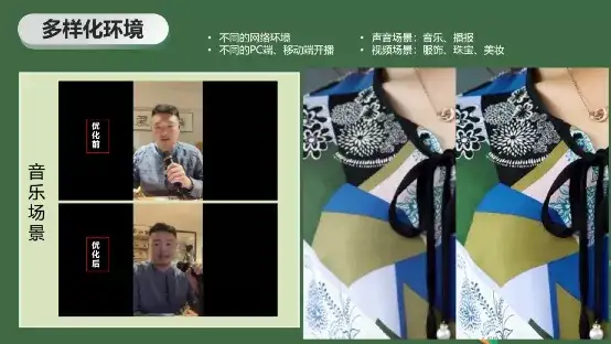 从内容角度来讲,包括声音场景和视觉场景,其实也要做很多场景自适应的算法。比如音乐场景,主播在卖一些音乐器材和音响设备。不针对场景进行优化的话,我们尝试听一下声音,可以发现一些音乐的呈现是不太清楚的,针对场景进行优化之后对音乐的表达就会更加清楚。
