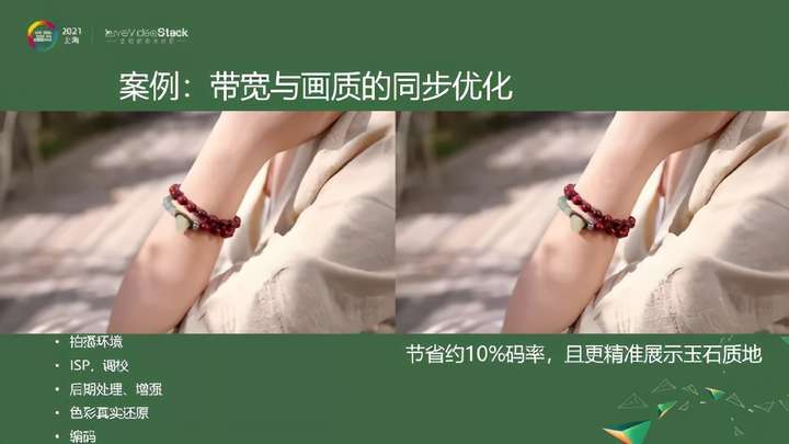 这里介绍一个案例。左边是一开始的情况,我们目的是希望降低码率的同时能更好得展示商品。可以看到右边展示的是提升之后的效果,码率节省了约10%,同时商品(玉石)的质地被更加精准地展示了出来。这背后除了拍摄环境要做好之外,还有一系列的技术因素,比如ISP要控制好,要做很好的调校,同时要做视频处理,包括增强的算法。另外,商品展示的部分要做更好的色彩还原,这一部分最终可能要用到HDR(高动态范围)和WCG(宽色域)。最后我们也需要做好编解码,使得在画质很高的情况下带宽不至于控制不住。