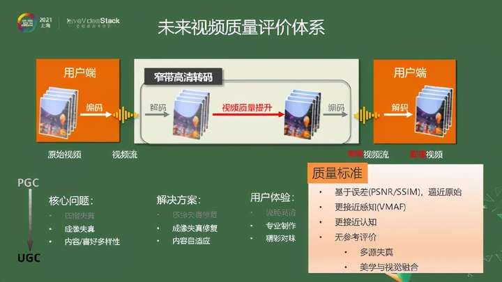 最后,高质量的视频需要编码才能在互联网上触达亿万用户,这个过程必然是有损的,所以这个损失要和前面的处理协作好,要巩固提升,不能因为编码把图像提升的效果给抹掉。