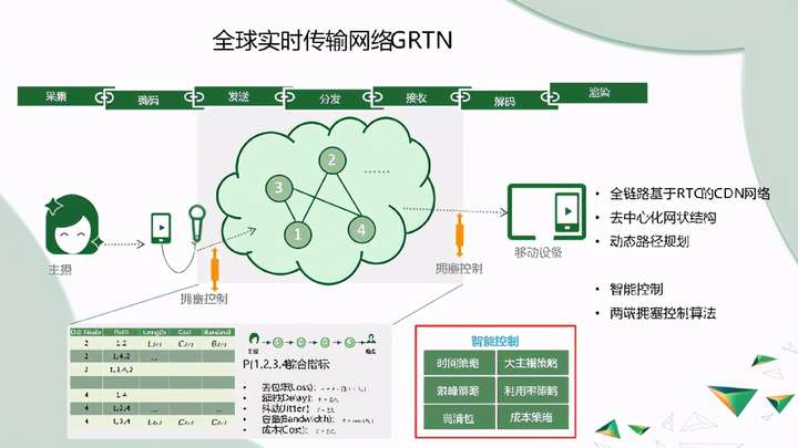 另外我想和大家分享就是阿里全球实时传输网络Global real-time transport network。这张网络是阿里集团共建的,很值得一提的,首先它是全链路基于RTC的CDN网络,和传统网络最大的不同是它可以做去中心化的组网。因为它背后有这样的flexibility,可以做更多的动态路径规划。比如说可以针对丢包率、延时、带宽等等方面的因素根据业务方面的需要去调整不同路径规划的策略。同时,因为这张网络在应用层是由我们自己掌控的,所以可以很好地做智能控制,大主播可以有不同的策略,包括做削峰填谷等等。它整体的核心思想就是我们根据业务需要分配和调度资源,一旦资源固定,我们会为您提供最好的QoE视频服务体验。