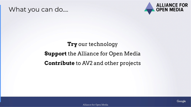因此,谷歌邀请大家都加入到开放媒体联盟中来,无论是通过使用AV1或是通过加入开放媒体联盟来表示支持,还是帮助设计和部署下一代视频和其他媒体技术。希望你们能与我们一起迎接这一挑战。