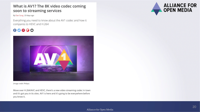 我们为所做的工作感到骄傲:建立了一个蓬勃发展的联盟,创建了AV1,并得到了很多终端的支持。但是,脸书、网飞和YouTube等公司支持AV1或加入开放媒体联盟的消息在中国的影响并不像在世界其他地方那么大。
