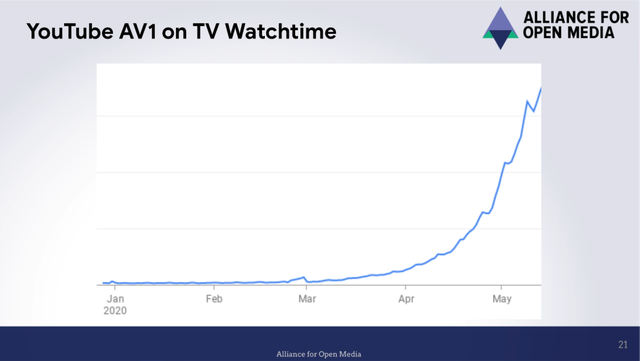 而且,随着越来越多完整的AV1硬件被应用到客厅设备和移动电话上,新的设备类型能够搭载AV1流,并具有比以前更高,更节能的性能。可以看到,YouTube在2020年型号的电视上支持AV1后,就能够立刻利用AV1的硬件编解码器来提供AV1的流服务。