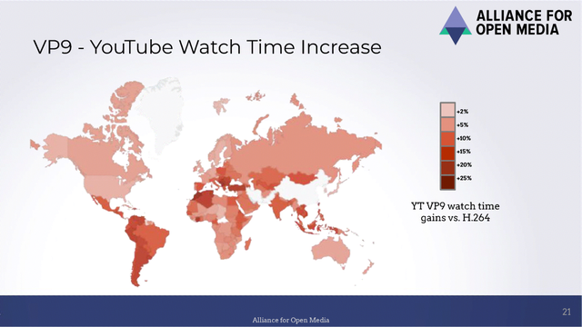 现在,在互联网连接非常发达的地区如北美、西欧和亚洲部分地区,人们已经获得了很好的YouTube体验,新编解码技术让这个已经很好的体验更上一层楼,这些用户也在持续增加他们的观看时间。YouTube在尽力改善这些用户的体验的同时也降低了自己的流媒体成本。