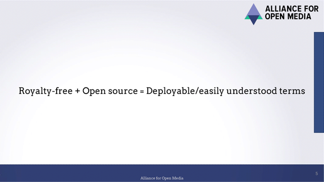 第一,对我们开发的每一项技术都承诺免版税专利许可。这是为了确保开发过程结束时,每个会员公司都免费授权技术,没有会员公司试图改变主意收取版税。但有人感到困惑,这是否意味着他们放弃了收取任何专利费用的权力。答案是否定的。虽然开放媒体联盟会员不能对其用于开放媒体联盟制定的标准范畴内的编解码技术的相关专利收取费用,但同样的专利应用于付费标准是可以在付费标准范畴内收取专利费用的。