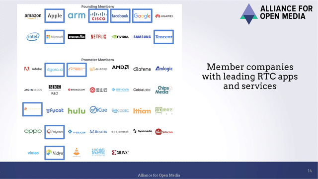 会员名单不仅反映了全球技术领军会员的深度,还显示了重要使用类型的广度。会员中包括开发关键流媒体服务的公司、实时通信领域的领军企业以及芯片和设备硬件开发的领军企业。这些不同的技术领先企业确保我们正在开发的技术,考虑了整个视频生态系统各个角落的输入。