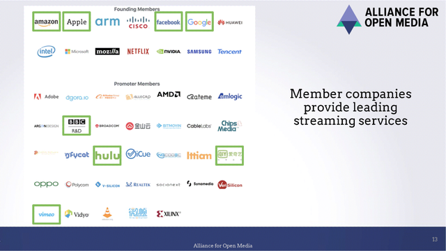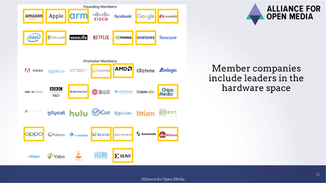 2015年,参与这些对话的公司一起成立了开放媒体联盟。会员名单上包括一群表面上看起来不太可能出现在一起的竞争对手——谷歌和微软、Amazon和网飞以及英特尔、AMD和ARM。
