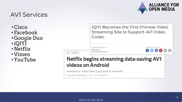 此外,我们在一些重要终端上进行了快速推广,使这些终端上的服务可以使用AV1。爱奇艺、脸书、网飞、Vimeo和YouTube都先期通过利用个人电脑浏览器和安卓手机上的软件解码器来使用AV1。