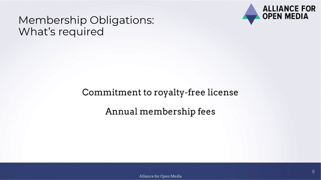 开放媒体联盟会员的第二项义务是缴纳年费。正如之前提到的,开放媒体联盟聘请了律师来确保正在开发一项免版税的技术。事实上,所收取的所有会员费都用于聘请帮助评估专利的律师。
