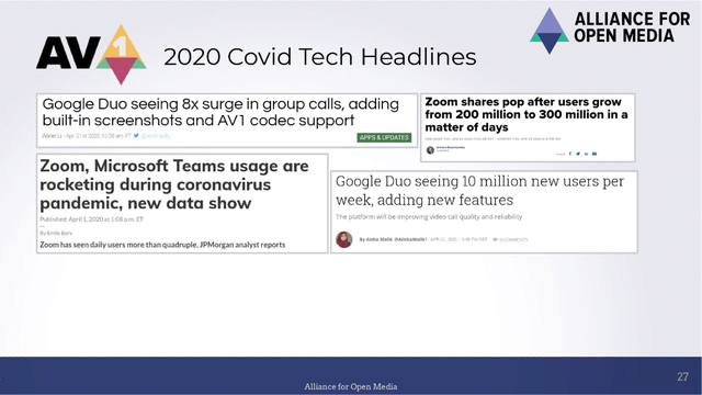 我们与Duo合作尤其引人注目,通过AV1,可以用低于60kb/s的速度实现真正良好的视频聊天体验,每秒60千比特,我们可以花一分钟来想想这件事是多么有意义。也就是说以拨号调制解调器的连接速度可以进行的视频会议,凸显了新压缩技术的力量,它确实有能力去改善人们的生活。