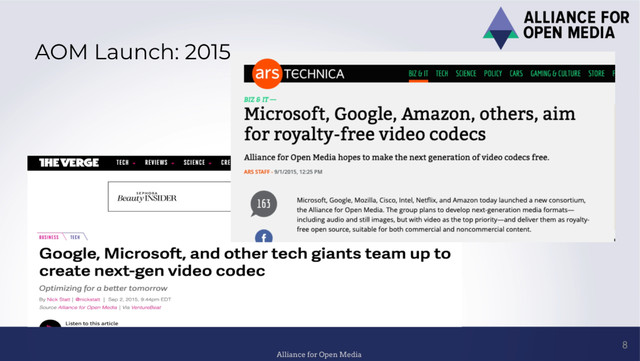 当我们推出第二代编解码技术——VP9的编解码技术,在与合作伙伴讨论项目时,发现越来越多的公司已经开始使用开源技术。这些公司对传统编解码技术的授权难而感到越来越沮丧。在讨论时,发现这些公司有着共同的原则,都将使用相同的媒体技术,都希望新技术开发出来后能尽快投入使用,我们可以共同努力创造新技术,同时仍然积极竞争开发使用这些技术的最佳产品和服务,以及,由于都是业务不断增长,为丰富的媒体体验创造设备和服务的公司,所以可以通过销售产品,而不是通过向新的编解码器收取高额专利使用费来赚钱。