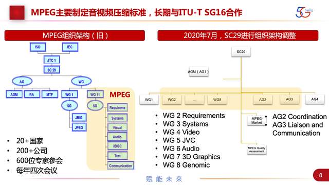 现在制定音视频压缩标准的主要的还是MPEG,32年前建立,现在经历了一系列的改革。以前在ISO、IEC的JTC1、SC29下面两个工作组是JPEG和MPEG,是早稻田大学的一对同学创立的,去年进行了改组。第一组还是JPEG,MPEG所有的组拆成了7个组,包括需求、系统、视频、JVC、音频、3D和基因。工作还是在继续,整个标准组有巨大的产业影响力、产业化能力,所以,整个标准组一直吸引很多方的参与,也产出了一系列AVC、HEVC等高价值的标准。现在也有了一些竞争标准组织,比如AOM、MPAI。这也从侧面说明这一市场价值非常大。