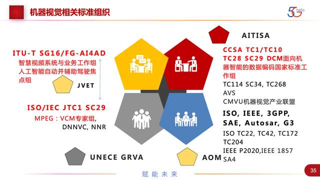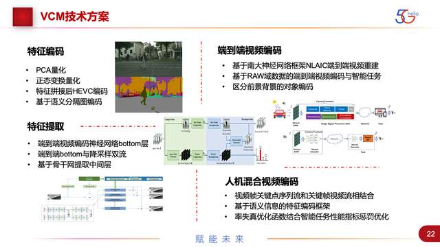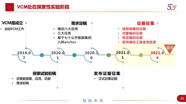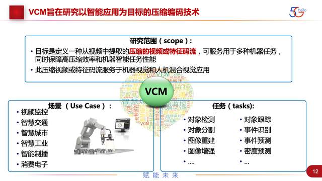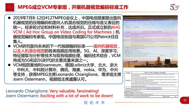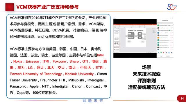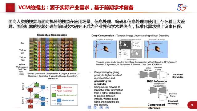 说到机器视觉编码(VCM),是从2014年开始就在策划和推动,中间也经历了一系列变化,于2019年成功。当时的逻辑是,因为我们有很多监控、工业场景,要大量基于视频来做分析,这与广电场景的信息处理、编码和信息使用上存在巨大差异,其实我们用H.264、H.265的编码的效率不够。基于产业需要,当时也做了学术界的调研,得出结论在专门针对机器的编解码方面有很大空间。支撑证据有意向编码结合对象的属性进行编码和生成。和直接在压缩域做任务,也可以重建,基于学术调研和产业需求,认为这件事是存在可行性的。我们也经过了一系列推广,从最开始提出面向智能安防场景。因为安防场景的背景基本上都是固定的,只有不多的前景变化,针对安防场景特定的压缩编码,效率可能提高到90%以上。当时MPEG组织接受了,但这件事没有推下去。后来我们分析,因为当年整个AI技术发展受限,5G网络环境也没有,虽然成功了,但没能把这件事做完。2017年我们又提了一次,是基于视频内容和语义特征进行编码,因为提到了应用层,没办法穷举,最后没被接受。一直到2019年,与美国GTI(芯片独角兽公司)联合,提出了面向机器视觉和人机混合视觉的压缩编码概念和框架,得到广泛认可,成立了机器视觉编码专家组。