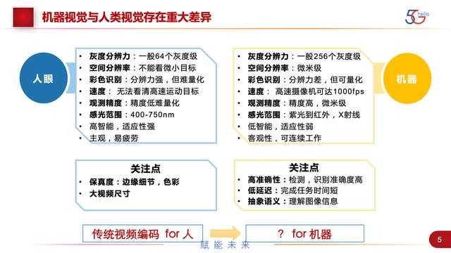 总结一下,人眼和机器算法看的是不同的东西。人看的是边缘、细节,对大尺度的视频要求视频保真。机器就是关注任务的完成,要的是语义级信息来做检测、识别等,之外还有时延的要求,机器需要语义信息,不需要人眼看到的。基于这些差别,我们可以得出一个结论,传统的视频编码与无失真或无限接近去还原视频的编码方法,其实是不适用于机器的。