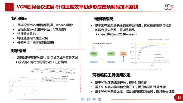 一个是特征编码,是我们组最开始提出的设想,会用特征代替视频,未来的空间很大,但目前它的性能还不是特别好。组内得到了一些方法,如目标检测ResNet网络中间层和kmeans量化、目标跟踪yolo网络中间层、特征通道重排、特征通道相关性去冗余,以及任务网络中间层的编码。