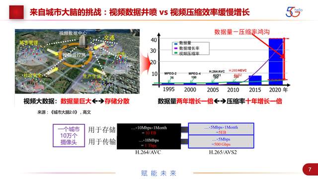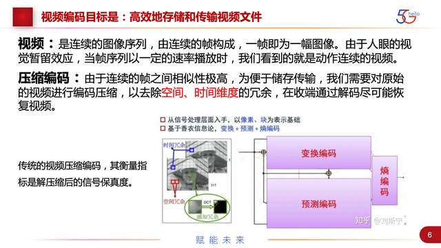 图中是现在网络上的数据量曲线,包括了一个对比,一代代视频编解码压缩率提升的对比,是呈线性增长,而数据量是指数增长的,数据量和压缩率之间存在巨大鸿沟。随着现在智能化或数字化的发展,鸿沟会越来越大。我们对于视频压缩算法和性能的需求还是很高的,不会随着光纤或5G的建设而降低。