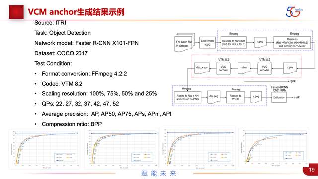 图中是一个anchor生成的例子,针对Object Detection、Faster R-CNN,用COCO数据集做出来的anchor。下的直线是没有经过压缩的数据,其他曲线是在不同的resolution和不同的QP下做的anchor,把VCM与这个进行对比,看性能是否可以支撑一个新的标准,以及产生相应的商业价值。右图是生成anchor的pipeline,也是出于标准化工作的考虑,整个组都会follow一样的程序来进行评估。