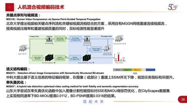 第四个是人机混合视频编码,包括了视频帧关键点序列流和关键帧视频流相结合、基于语义信息的特征编码框架,以及率失真优化函数结合智能任务性能优化等。