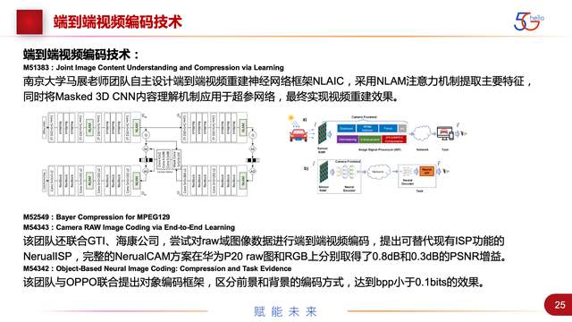第二个是端到端视频编码,它的性能比较好,基于compressAI的模型有相应的结果,做了一些优化调整。比如南大提了网络框架,也提升了一些性能。还有基于RAW域数据的端到端压缩编码,主要是性能不下降,也可以节省出ISP的时延。还有基于前景和背景的对象编码。