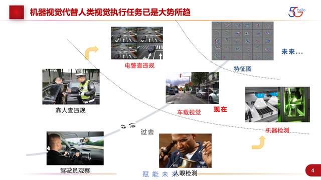 从这个背景,我们可以分析出,我们用机器视觉算法来代替人工处理任务已经是大势所趋。在过去监控的场景,如道路查违规、驾驶的场景,以及检测的场景,是以人为主。现在是机器逐渐在占据主导。电子眼已经广泛地使用,车载视觉都是L2、L3级别的自动驾驶,以及机器质量检测、故障检测,这些算法都非常普遍。