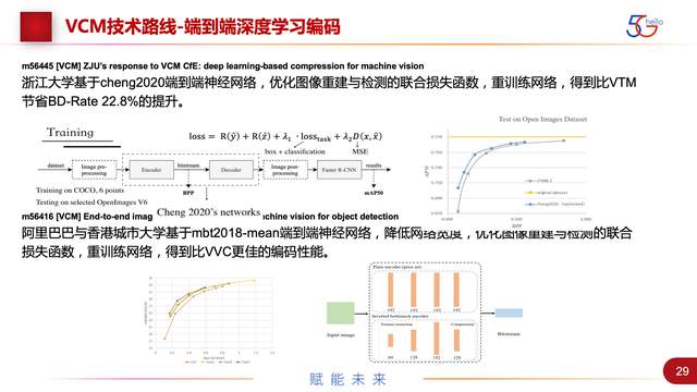 端到端编码是目前性能是最好的,这次被接受的两个证据是,基于cheng2020/mbt2018这两个网络进行了重训练,做了端到端的优化和改进,也优化了图像重建和检测的损失函数,性能提升有20%~30%。浙江大学基于cheng2020端到端神经网络,比VTM节省了BD-Rate 22.8%的提升。阿里和香港城市大学基于mbt2018端到端神经网络,比VVC提升了20%~30%。