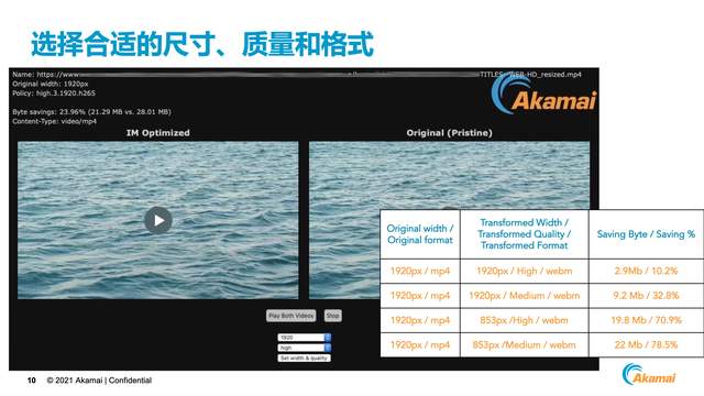 接下来我们也分享更多的细节,非常重要的一点是*衡尺寸、质量和文件大小的关系。Akamai后台有工具可以帮助我们在设定策略时,选择合适的尺寸、质量和格式。比如一个1920px宽度的mp4视频文件,通过工具我们可以看到选择转换成不同的尺寸、质量和格式时文件大小的节省是不一样的。如果保持1920px的宽度,选择转换成high的质量和webm的格式,相比原始文件可以节省10.2%的大小。同样保持1920px的像素宽度,我们把它转成medium质量的话,可以节省32.8%的大小。对于一些小屏幕的终端设备,可以把它转成 853px的像素,同时保持high的视频质量,这时大小可以节省70.9%。通过这样的工具,可以提前看到使用之后的效果,*衡尺寸、质量以及文件大小的关系。