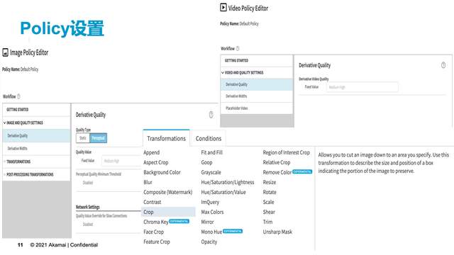 接下来我们可以看一下在后台设置Policy的界面。上面分别是Image Policy Editor和Video Policy Editor的配置界面。整个过程非常的简单,如果是图片,可以设置转换后图片的质量和宽度,如果需要对图片进行艺术转换,可以设置转换的策略。转换的策略有非常多的类型,前面也有提到,比如说加水印、裁剪、翻转、图片镜像等,这些功能一应俱全。对视频来说只需要设置好转化后的视频质量和视频宽度就可以了。