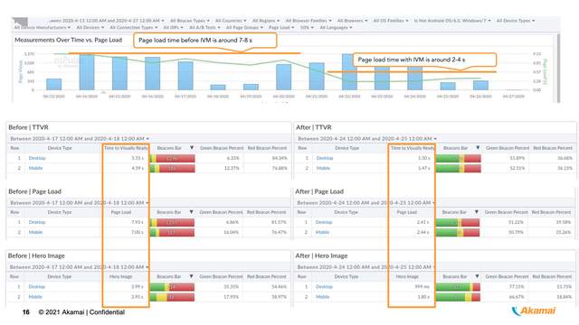 前面是单个用户的情况,通过Akamai RUM工具mPulse可以看到整体用户使用的效果。对比优化前和优化后,从Page load time来说,在4.21使用IVM之前,整个页面的加载时间是7-8s,但是在优化之后,*均Page load time变成了2-4s,这其实是个非常明显的效果。同样在其他维度,TTVR和它的Hero Image的图片,都有类似优化的效果。