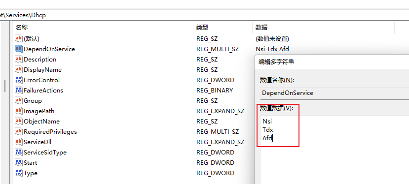 现在需要对注册表"SYSTEM\CurrentControlSet\Services\Dhcp"中的一个子类"DependOnService"设置一个多字符类型的值,多字符类型如下图所示: