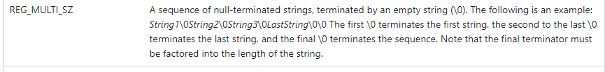 REG_MULTI_SZ 多字符串注意分隔符:"\0",结尾也不能忘记,还要注意字符串大小,防止只设置成功一个字符。