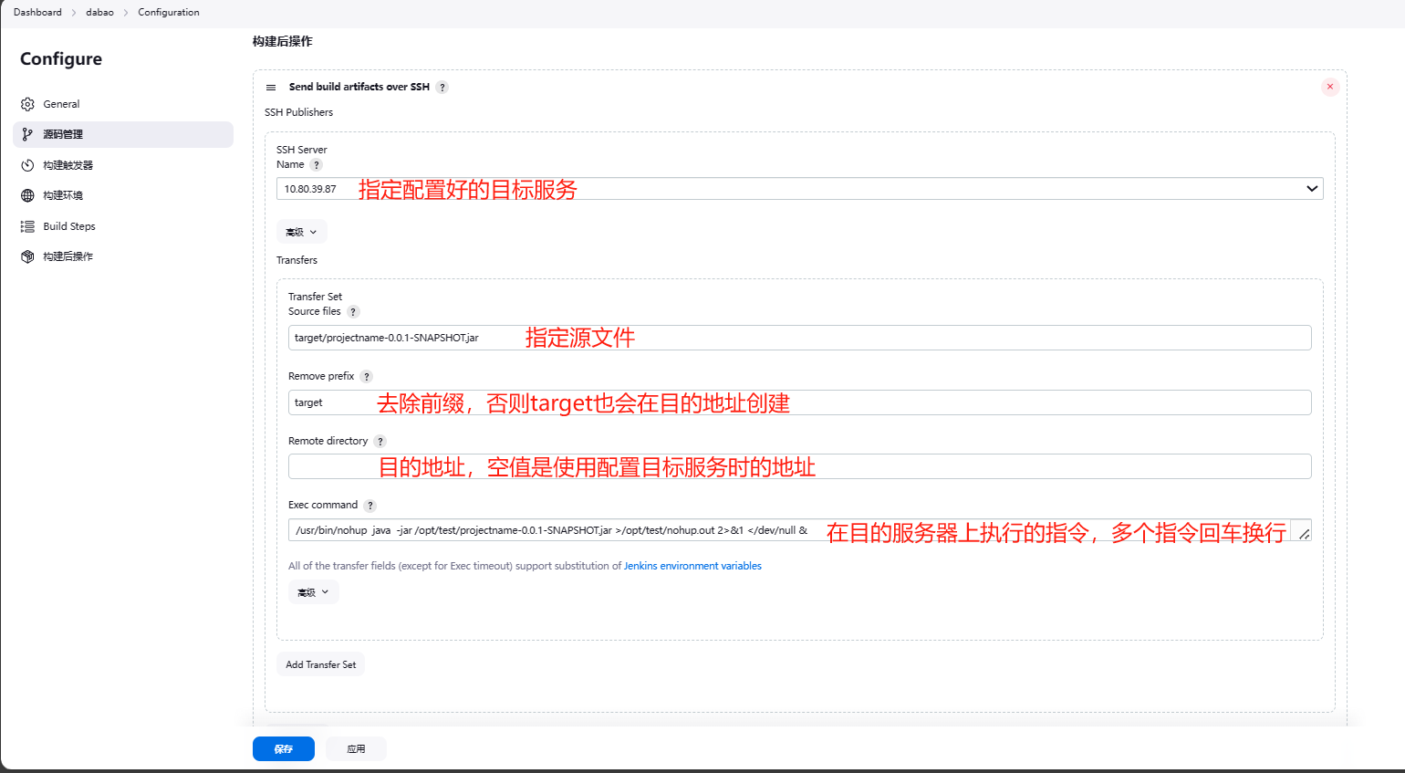 jar包构建好后,就可以根据情况发布到测试或者生产环境,此处需要用到之前下载好的插件Publish Over SSH