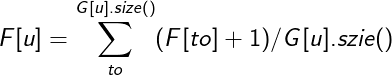 对于同一个scc的边,按上面的公式就可以了,如果\(u->to。scc[u]!=scc[to]\),那么f[to]一定知道了。就是常数项\(+(f[to]+1)/G[u].sie()\)